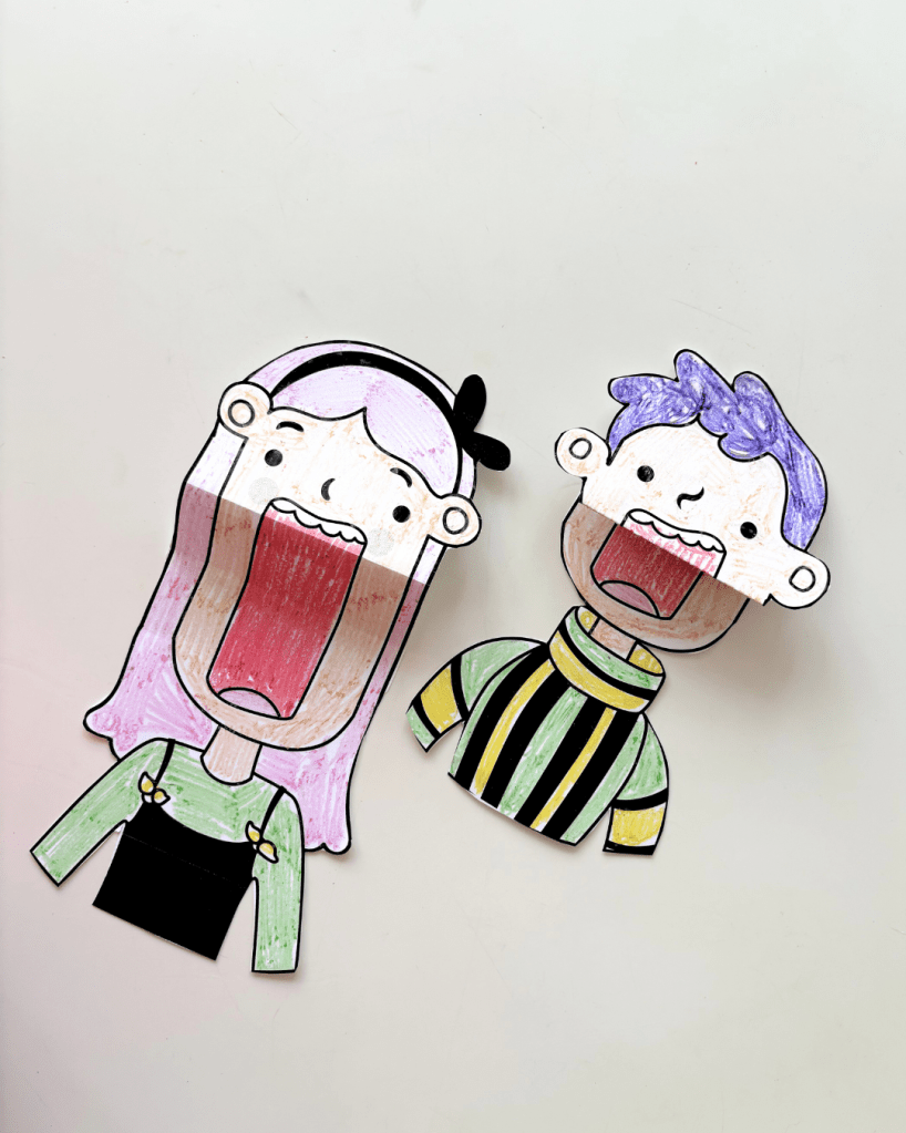 - Colour the characters – kids can get creative with hair, clothes, and accessories.